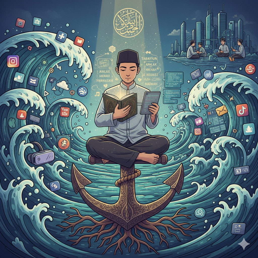 Peran pertama santri adalah sebagai filter moral dan penjernih informasi. Teknologi telah mengubah dunia menjadi sebuah pasar informasi raksasa yang riuh. Di dalamnya, berita benar, hoaks, fitnah, dan konten tak bermanfaat bercampur aduk. Di sinilah tradisi keilmuan pesantren menjadi relevan. Seorang santri terdidik dengan prinsip tabayyun (klarifikasi) dan kehati-hatian dalam menerima berita. Mereka dilatih untuk menimbang mana yang haq (benar) dan mana yang bathil (salah), mana yang membawa manfaat dan mana yang mendatangkan mudharat. Di era digital, peran ini meluas menjadi promotor literasi digital di masyarakat, mengajarkan bagaimana memilah informasi dengan bijak agar umat tidak terseret arus perpecahan dan kesia-siaan.